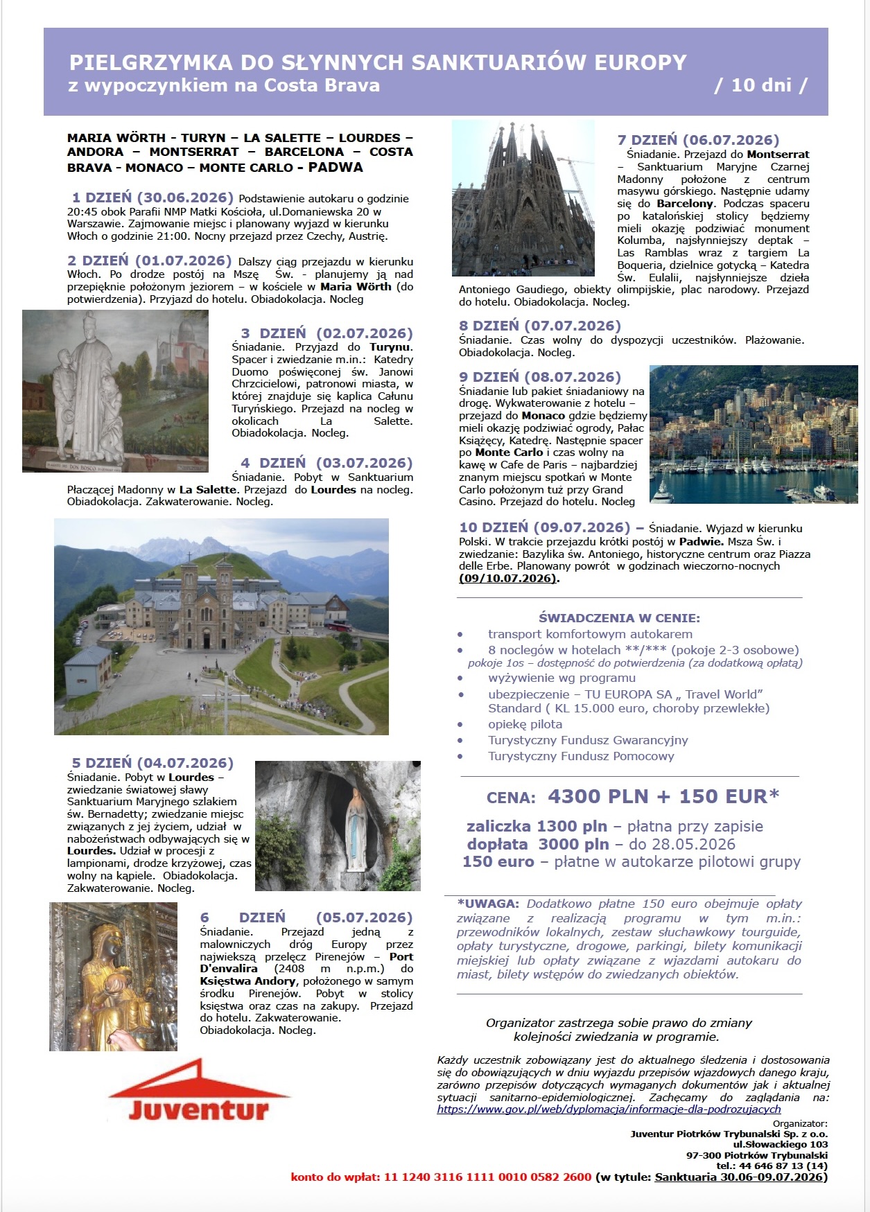 Koszt - 4300 PLN + 150 Euro. Zaliczka 1300 PLN przy zapisie, dopłata 3000 PLN do 28.05, 150 Euro płatne w autokarze.
